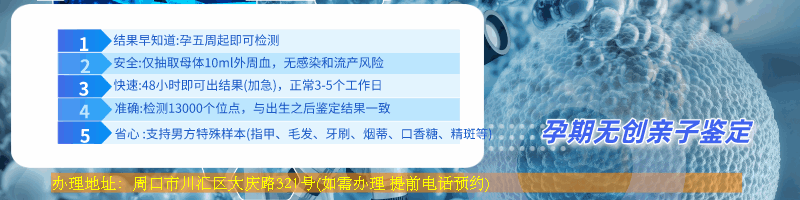 周口亲子鉴定受理咨询处是一家专业的亲子鉴定服务机构,由全国多家权威司法鉴定所联合协作,拥有丰富的DNA鉴定经验和专业的技术团队。周口亲子鉴定受理咨询处全国各地的DNA亲子鉴定服务网点,无论是个人隐私亲子鉴定、亲子鉴定上户口,还是胎儿亲子鉴定中高考亲子鉴定等,都能够轻松办理。协同权威机构出具的鉴定结果准确率99.99%,并对结果承担法律责任,出具的司法亲子鉴定报告可以国内外通用。